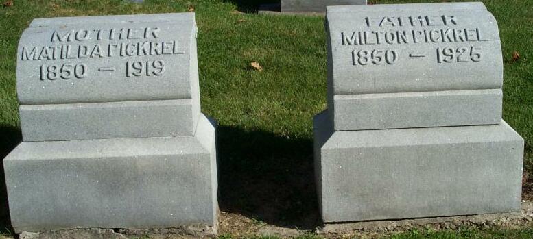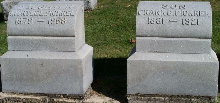 This tombstone was lying on the ground for many years. In early 2001 I had it re-erected. His daughter, Matilda Melissa Franklin Pickrel, and her husband Milton and their children Myrtle and Frank are also buried there: