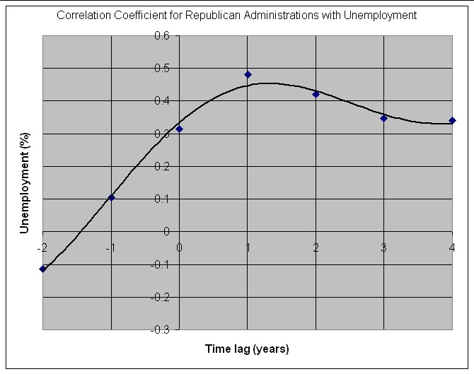 | The following graph shows the correlation coefficient between Republican administrations and unemployment for the last 56 years. |