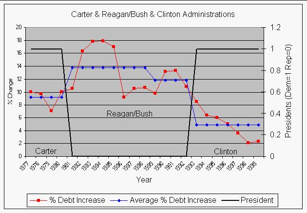 The following table shows the % federal debt increase for each year and the average yearly increase during the separate Carter, Reagan, Bush and Clinton administrations. It clearly points out the abysmal record of the Reagan/Bush administrations compared to the Clinton administration, and even to the Carter administration. Mr. Reagan instituted large tax cuts without reducing expenditures. Note that the federal debt increased every year even during the Clinton administration, although its rate of increase decreased.