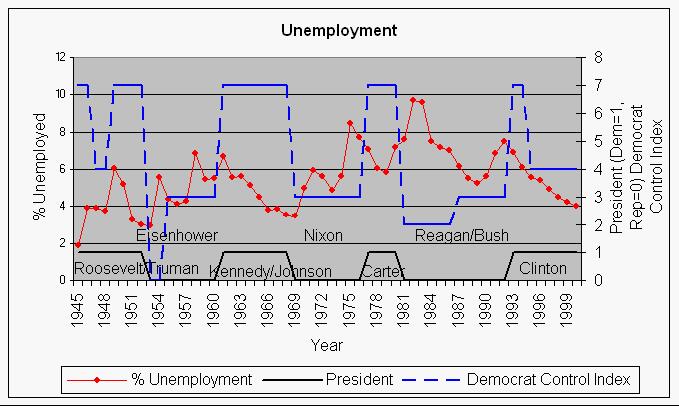 1945-2000 compared to the presidential terms (Dem=1, Rep=0) and Democratic