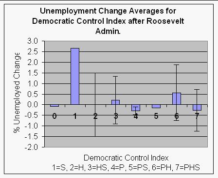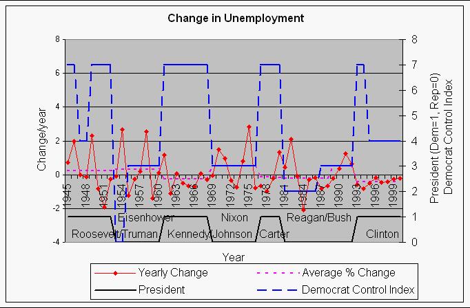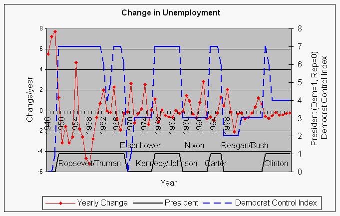 compared to the presidential terms (Dem=1, Rep=0) and Democratic control index