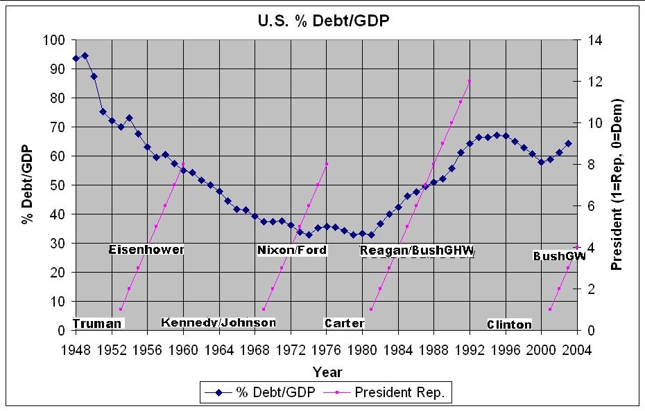 | The following graph shows the Debt/GDP (in %) data and the presidential administrations for the last 56 years. |