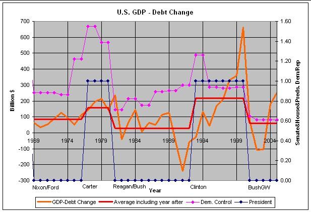 It is very clear that the GDP - Debt change was higher during the Carter and Clinton Democratic administrations than it was during the Nixon/Ford, Reagan/Bush and BushGW Republican administrations. Note that the only times with the difference was negative was during the Reagan/Bush (once for each) and the BushGW Republican administrations.