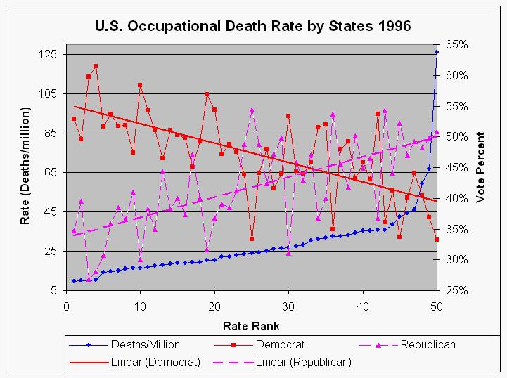 My Republican native state, Oklahoma (rate=59.3), ranked 48 of 50 and my Republican adopted state, Virginia (rate=19.2), ranked 17 of 50 for increasing occupational-death rate in 1997-8.