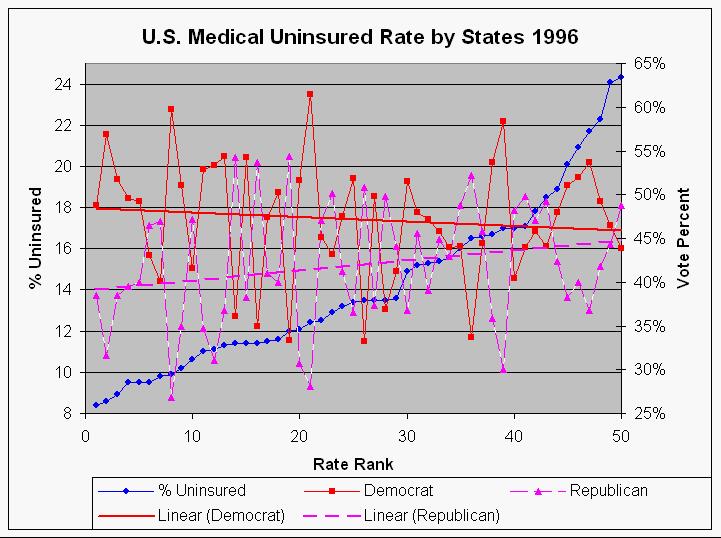 I compared different state's medical-uninsured rate (MUR) data for 1996 with the results of the 1996 presidential election for each state. (See table at end for votes in the 1996 election.) A correlation calculation yielded the following: