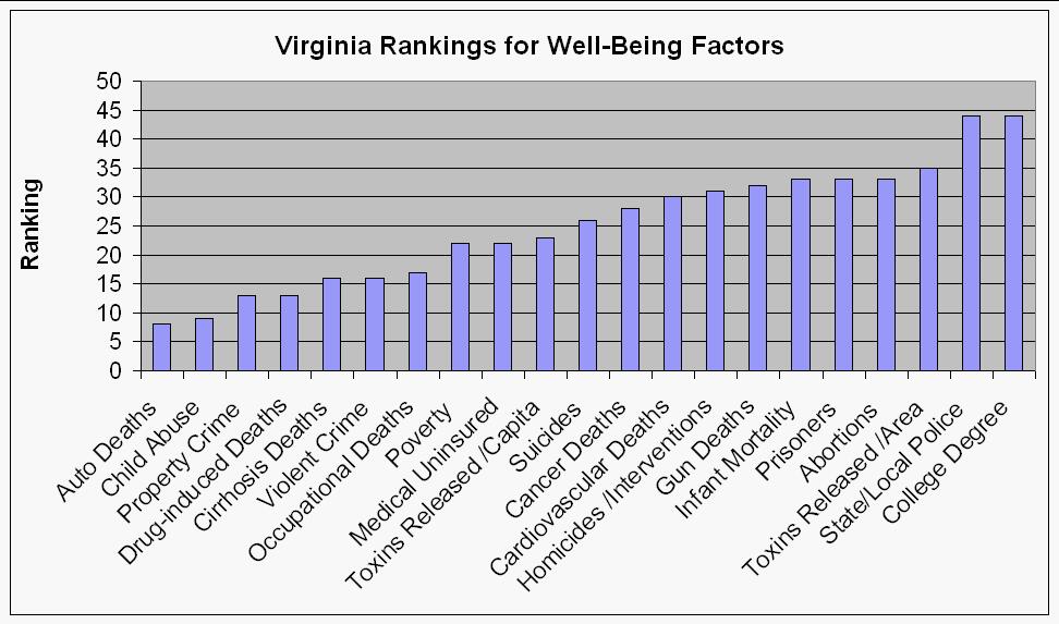 In another location I have calculated the correlations of political-party voting in the 1996 U.S. presidential with several well-being factors. In the process each state was ranked for each well-being factor. Since I live in the state of Virginia, I include here a graph showing Virginia's rankings for the several factors: