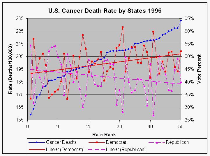 My Republican native state, Oklahoma (rate=204), ranked 25 of 50 and my Republican adopted state, Virginia (rate=209), ranked 28 of 50 for increasing cancer-death rate in 1996.