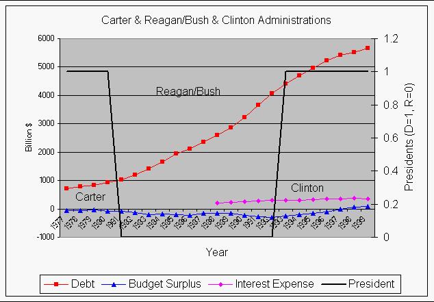 The figure below shows the federal debt, the federal surplus/deficit and the interest on the federal debt for the Carter, Reagan/Bush and the Clinton administrations. Note that the federal debt is huge compared to the minuscule surpluses in recent years and just the interest on the federal debt is several times larger than the much-lauded surpluses.