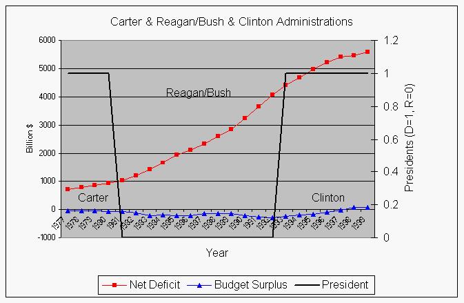 The figure below shows what I call the Net Deficit for each year, obtained by subtracting any so-called surplus from the federal debt, for the Carter, Reagan/Bush and the Clinton administrations. It is equal to the federal debt during the Carter and the Reagan/Bush years and has finally gone slightly below the debt in the last two Clinton Years because of a small "surplus". It appears that it will also for this year (2000).