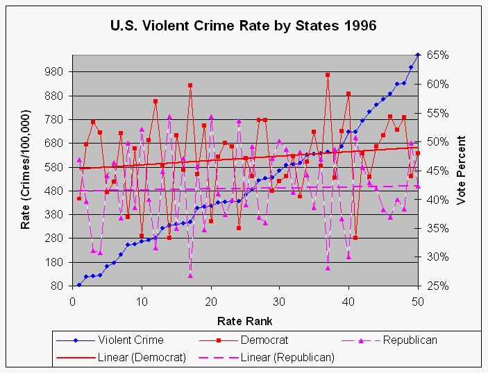 I compared different state's violent-crime rate (VCR) data for 1996 with the results of the 1996 presidential election for each state. (See table at end for votes in the 1996 election.) A correlation calculation yielded the following: