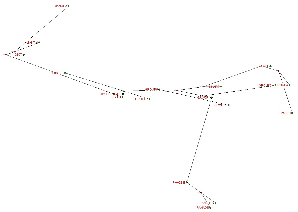 This phylogenetic network compares the unique Chitpavan testees to the four haplogroups: