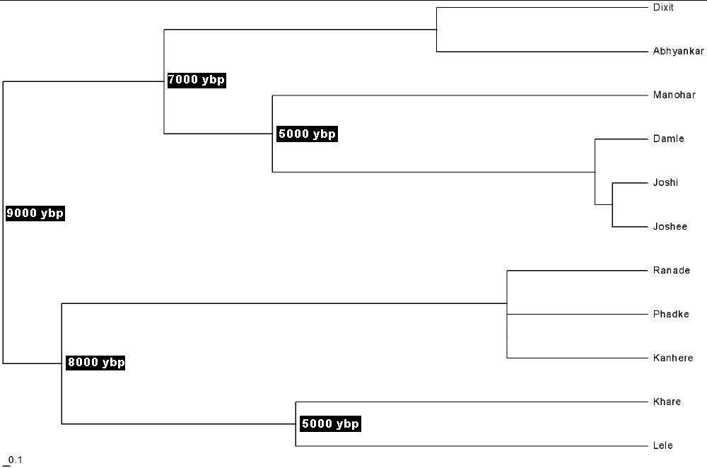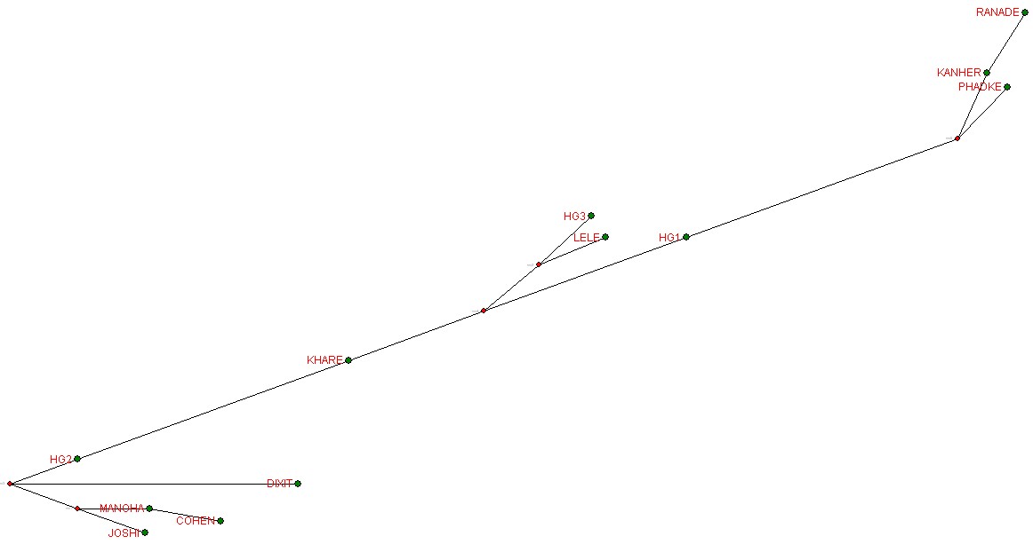 Another way to visualize the relationships among the testees is by time-ordered (rooted tree) phylograms calculated from relative-mutations matrices. To create time-ordered phylograms, I use the PHYLIP Neighbor software, with the UPGMA option (Unweighted Pair Group Method with Arithmetic Mean), and the relative-mutations matrix to generate a tree file (*.tre) to be plotted by the TreeView software. (For a description of how I do it, see PHYLIPTreeViewUse.htm.) Here is a phylogram for the Chitpavans: