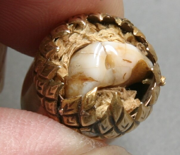 | Pictures of the tooth in its gold-acorn case taken by Jean Marie Pegrin Starr. |