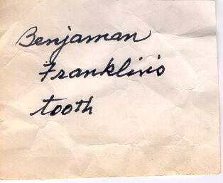 Perhaps some enterprising dentist once pulled out a tooth of this famous man, Benjamin Franklin, and decided to keep it as a valuable artifact related to Benjamin. Perhaps the dentist authenticated it with a document. And perhaps he sold or gave the tooth and documentation to someone. And perhaps someone still has the tooth and documentation. Given all of these possibilities, how would one go about finding such a tooth and documentation? It has been suggested that advertisements in dental journals in the USA, Great Britain and France might yield such a tooth. This should definitely be tried, although the odds of success are probably about the same as winning a multi-state lottery.