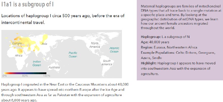 Haplogroup I1Haplogroup I1 has been found at very low frequencies across central Asia. People bearing this haplogroup probably made their way west across Asia following the Silk Road, a corridor of trade that brought spices and silks to Europe, where I1 can be found at very low levels in Hungary and France.
