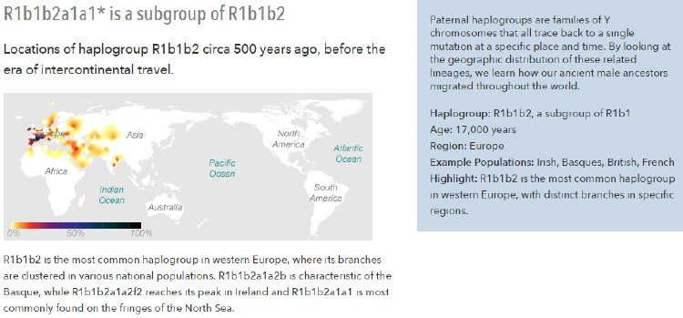 Haplogroup R1b1b2a1a1Today R1b1b2a1a1 is found mostly on the fringes of the North Sea in England, Germany and the Netherlands, where it reaches levels of one-third. That distribution suggests that some of the first men to bear the haplogroup in their Y-chromosomes were residents of Doggerland, a real-life Atlantis that was swallowed up by rising seas in the millennia following the Ice Age.