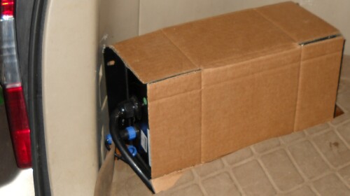 I constructed a cover of cardboard for the charger to protect it from large dogs and cargo: