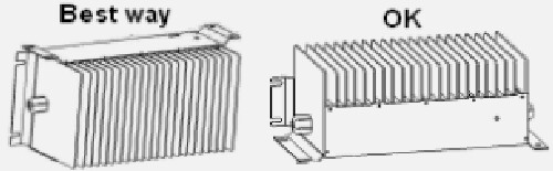 I think the orientation on the left is turned upside down; the mounting bracket should be on the bottom as in the picture above. I like the corrected left orientation better because the right orientation would collect debris between the fins.