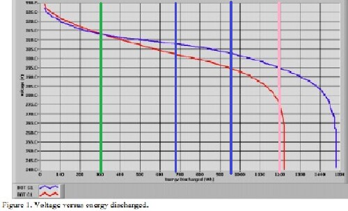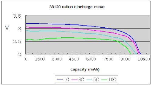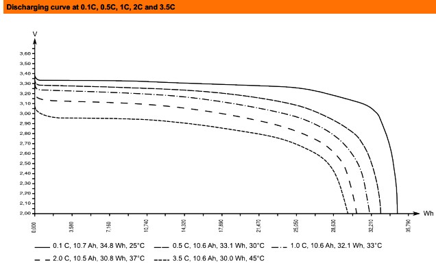Lithium-ion with LiFePO4 cathode and graphite anode; 216 HeadWay 38120S 10-Ah capacity at 1C, continuous current of 10C, ~3.2-volts cells in parallel pairs in the battery pack for ~346 volts and ~7.2-kWh energy stored. (See graphs below.) Made by http://www.headway-cn.com. (A continuous current of 10C means that 100 amperes will discharge a 10-Ah battery in one hour.) Cell specifications and download a pdf and another.