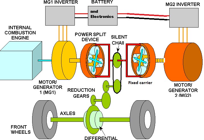 This is a rough diagram of the power-split device (planetary gear set or epicycle gears) for the Prius Hybrid Synergy Drive: