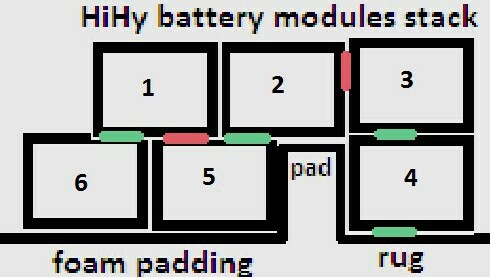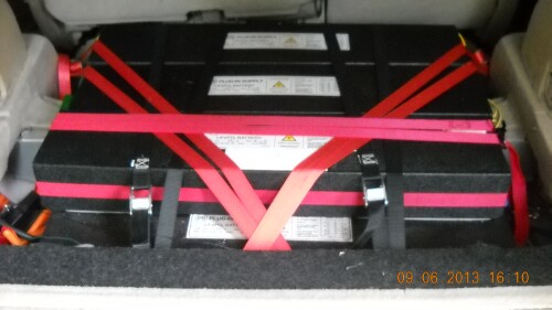 The six modules are placed in two layers of three modules in the 3rd-row seat's well. The pack is secured to the vehicle by four straps attached to the 2nd-row seat base in front and by Velcro between the bottom front battery and the rug below it and between the modules::