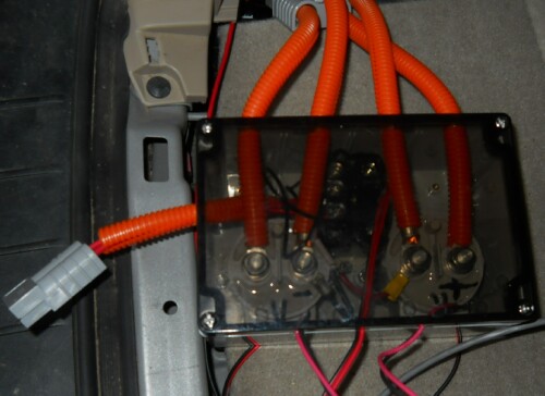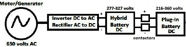 The plug-in battery (PIB) is connected in parallel to the hybrid battery (HB) by two contactors, one for the negative wire and one for the positive wire. Two contactors are for redundancy to make sure that the HB is never overcharged by the PIB: When the HB is above a certain voltage, perhaps ~315-volts, less than its maximum voltage, ~325-volts, the contactors are open, so that current cannot exist from a highly-charged ~350-volts PIB into the HB. The result is that the HB is always nearly full after a full charging of the PIB until the PIB voltage gets below the contactors' cutoff voltage.