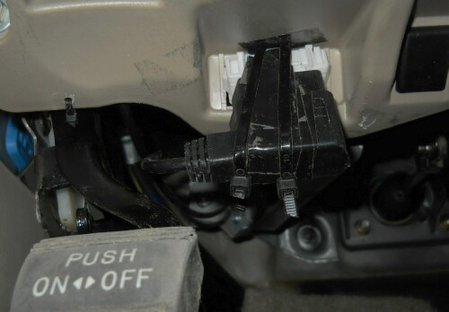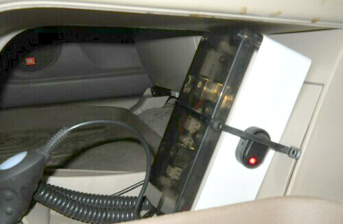 Its OBDII cable is run under the dash to plug into the OBDII receptacle very near the foot-actuated emergency brake. In fact, a foot can easily unplug the OBDII cable, so two plastic ties hold the cable onto the receptacle: