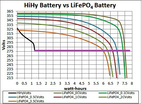 Plot of the HiHy NiMH-battery discharge curve, adjusted for 96,000 miles, along with the LiFePO4-battery discharge curves for 0C (brown curve for zero current extrapolated from higher C curves), 0.1C, 0.5C, 1C, 2C and 3.5C currents: