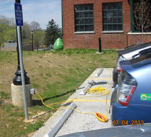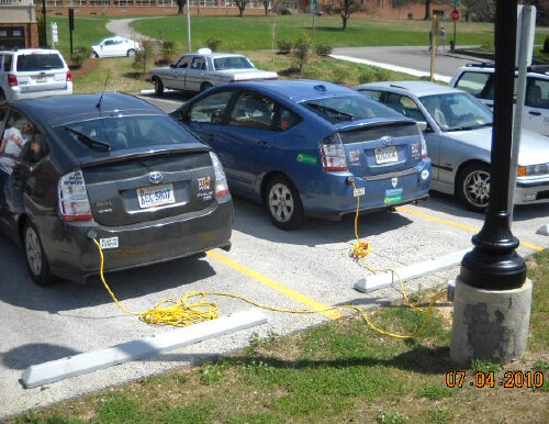 Plugging in my Prius and the Bixler Prius at the Blacksburg-Motor-Company building of the Town of Blacksburg VA:
