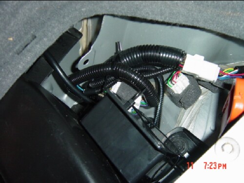 The black box on the left is the trickle charger. Its black double input wire and plug is left hanging out the back of the trunk. The red and black output wires to the auxiliary battery are shown on the right. If you do this, put a towel under the bolt that connects the negative wire of the battery to the chassis, so that you do not accidentally drop the bolt down in the gap behind the battery. Also, when you disconnect the battery, the alarm will sound in the car.