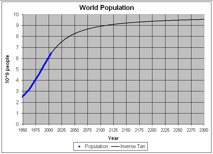 Fitting the World population data with an asymmetric function that has a long tail (the generalized inverse tangent function) yields an excellent fit to the data and very precise values for the population parameters (final population = 6.0 billion, half date = 1960). The rise to the final population is much faster than was the rise from zero population. Our World population projection is in reasonable agreement with Brown's (13) population-stabilization timetable and Bogue's (14) 1967 prediction of an end to the population explosion. It also is in agreement with Tuerpe's (15) two sector World model.