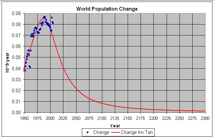 The following graphs show the population and population-change data for 1950-2005 and projections to 2300 for this fit.