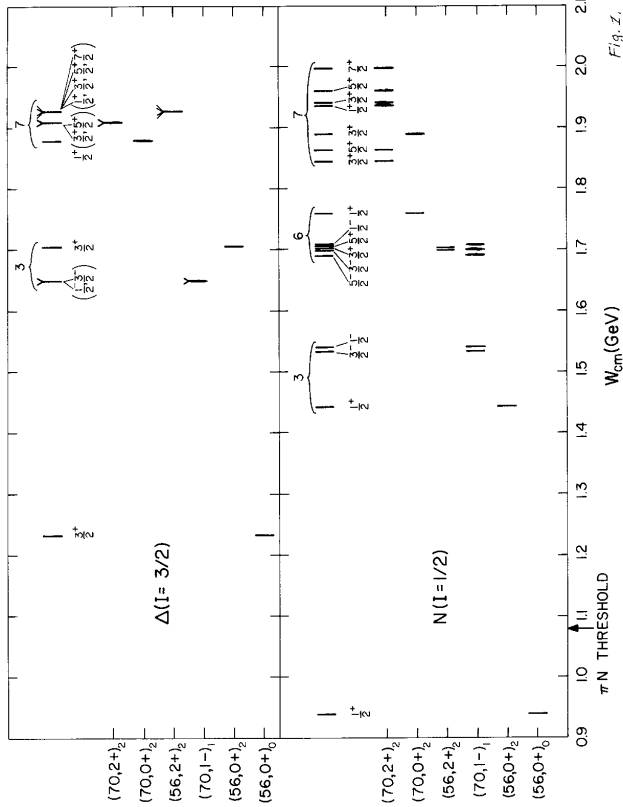 With these presentations to an international conference a certain revolution was completed and the succeeding years consolidated the new regime[21]. The revolution was the large number of new pion-nucleon resonances discovered, which brought about a new way of regarding resonances. Previously explanations of, say pion-nucleon, resonances were sought in detailed dynamical calculations involving the exchange of elementary particles between the pion and the nucleon. Indeed, an explanation of the existence of the nucleon itself was sought in this way, the nucleon being regarded as a Pll state of the pion-nucleon system. Such a calculation should certainly have predicted the Roper, or Pll resonance - but it did not[22]. This philosophy was not disproved or even totally abandoned - indeed it could coexist with the quark model - but simply fell into relative disuse over the succeeding years in the face of a naive quark model which has greater predictive power though being still illogical and incomplete. The contribution of the pion-nucleon partial-wave analyses to the revolution was the discovery of the "hidden" low-angular-momentum resonances, and eventually of, it appears, all of the resonances up to a certain energy. In fact the existence of the resonances of the 70-dimensional LP=1- multiplet, and no other 'low energy' negative-parity resonances is still one of the most convincing pieces of evidence for the quark model - along, incidentally, with the success of the quark-model predictions on the photon + nucleon (i.e. electromagnetic) formation of these same resonances. (Photoproduction is a whole other chapter in the resonance story.)