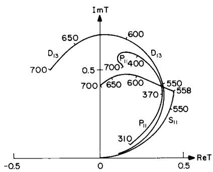 T(Sll) obtained by Bareyre et al. in their phase shift analysis of the pion-nucleon