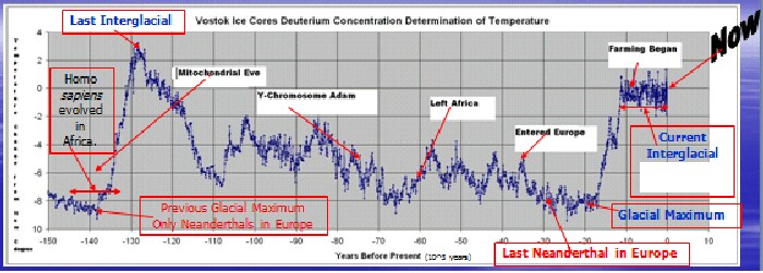 Homo sapiens evolved into "intelligent" animals over the last 150,000 years due to the extreme climate changes from the end of the penultimate Major Ice Age about 140,000 years ago through the last Major Interglacial about 130,000 years ago into the beginning of the last Major Ice Age, as shown in the following graph: