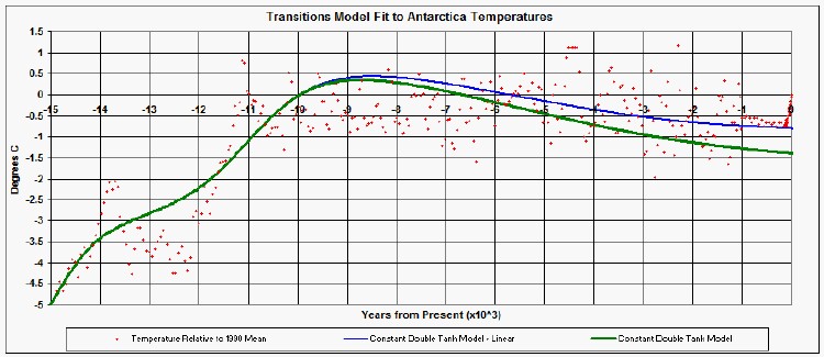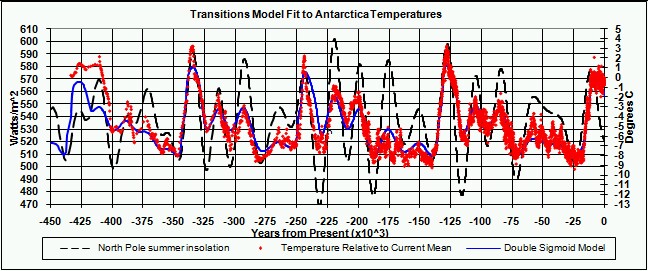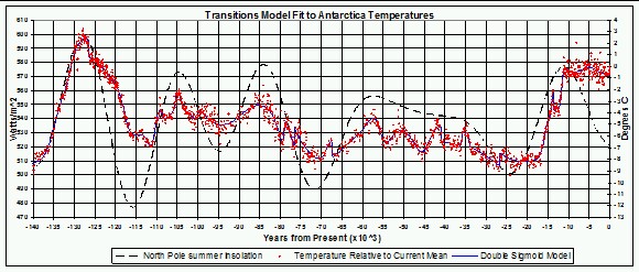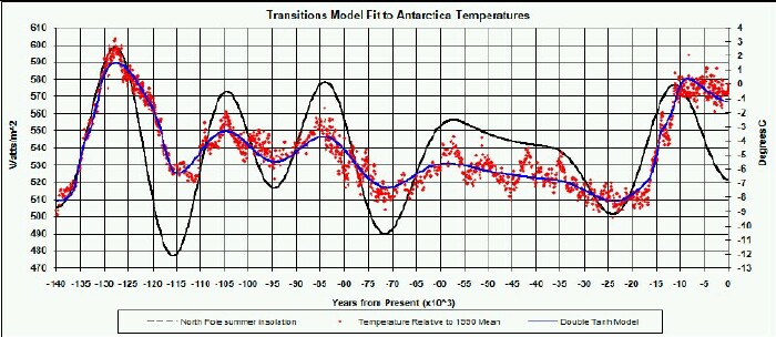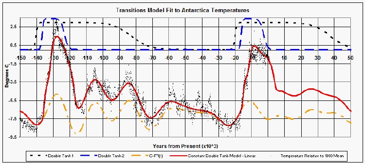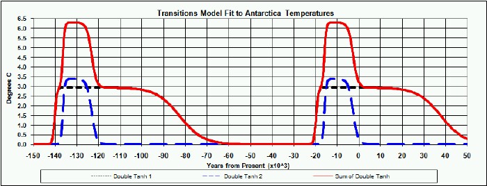 The blue-curve fit is reasonably good since about 400,000 years ago, especially for the last Major Ice Age from about 140,000 years ago. Fitting the Vostok temperature data for just the last Major Ice Age (back to 140,000 years ago) with two double-hyperbolic-tangents representing two Earth-states transitions yields the blue curve in this graph: