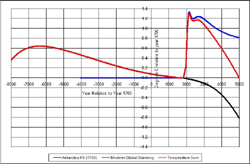 The red curve is the sum of the blue curve (Modern Global Warming normalized to year 1700) and the black curve (fit to Antarctica data normalized to year 1700). The Modern Global Warming curve does not include any non-linear effects, such as methane release in the Arctic.