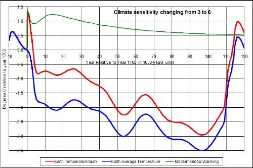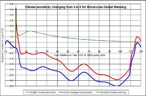 The global-warming temperatures shown above were calculated with a constant climate sensitivity of 3. However, there are indications that climate sensitivity is 3 for short times (decades to centuries) and perhaps 6 for long times (millenia).