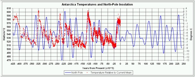 The insolation is extended out to 250,000 years into the future. The earliest temperatures are of lower accuracy than the latest temperatures. Four past Major Ice Ages are clearly seen. (1990 is zero time in this graph and the graphs below.)