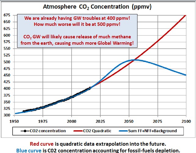 The dominant effect of these three reductions would be due to coal reduction: The coal peak is lowered from 20,000 x 109 ST/year to 9,000 x 109 ST/year, about one-half reduction, and its location reduced from year 2040 to 2015. With these reductions, especially for coal, CO2 emissions would probably peak at ~425 ppmv at ~2030 and then gradually decline. This assumes that methane release from Arctic tundra and methane clathrates on continental shelves do not become great!
