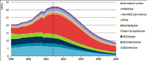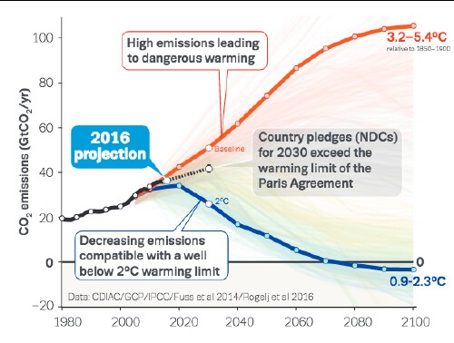 In order to keep the earth's average temperature 2°C below pre-industrial temperature, the blue curve for global emissions in the graph below must apply: