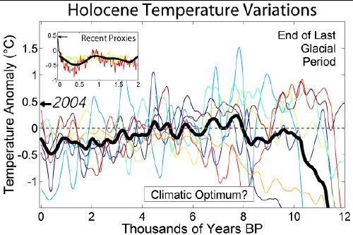 Some global-warming deniers claim that the average Earth temperature was higher earlier in the Current Major Interglacial (the Holocene) than it is now. The following graph shows that the claim is incorrect.