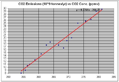 This is a crude analysis because other variables also effect atmospheric temperature; e.g., methane concentration in the atmosphere.