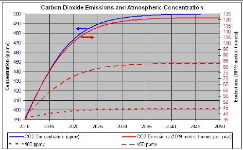 If governments wish to limit CO2 concentration in the atmosphere to 450 or 500 ppmv, the following plot shows the total emissions limits: