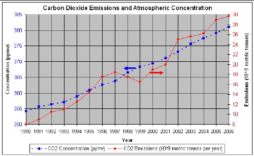 The following is a plot of emissions data and concentration data for the world for recent years: