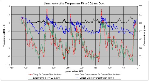 A linear fit of the temperature to the CO2 and the dust concentrations yields the fit shown in the graph above. The formula for the fit is