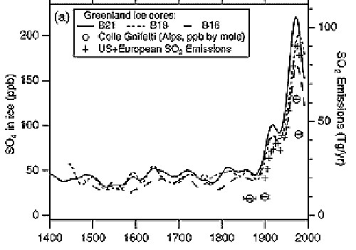 The correlation can be clearly seen between declining temperature in the graph above and sulfur dioxide put into the atmosphere in the graph below: