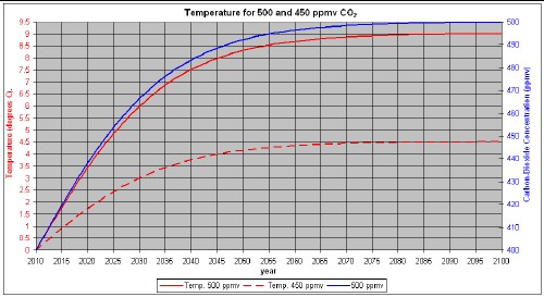 As an interesting exercise consider the unachievable case where all aerosols have been eliminated from the atmosphere. Using the formula given above with the dust concentration set to zero yields the following temperature for the two cases of eventual CO2 concentration of 450 ppmv and 500 ppmv by the year 2100: