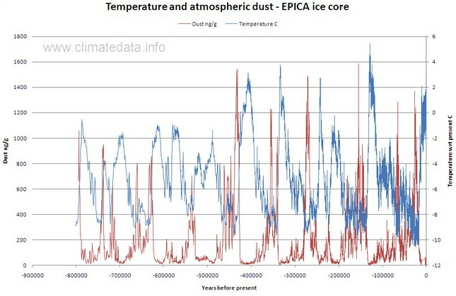 Dust concentration data in the atmosphere have been measured in ice cores at Vostok, Antarctica: