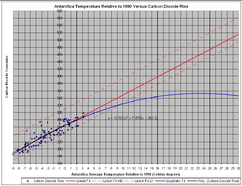 The linear extraplation with an error band indicates an eventual Antarctica temperature of over 20o Celsius above 1990 temperature for 400 ppmv CO2 concentration. (The quadratic extrapolation yields runaway temperatures.) There is a time lag of a few hundred to thousands of years between changes of one of these two mutually positive-feedback variables and changes in the other, so the word "eventual" is used.